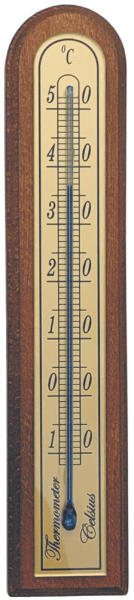 Fából készült szobahőmérő. Anyag; fa, skála 1,5 mm-es ferde plexiüvegből készült. Méretek: 42 x 205 [mm]. A készülék mérési tartománya: -10°C és +50°C között (kapilláris, higyanymentes folyadék)