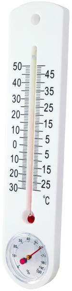 Műanyagból készült termohigrométer. Mérési tartomány: Hőmérséklet: +50 °C ± 1 °C. Relatív páratartalom: 0% ... 100% ± 5% Higanymentes hőmérő. Méretek: 25 x 5,5 x 2 cm.
