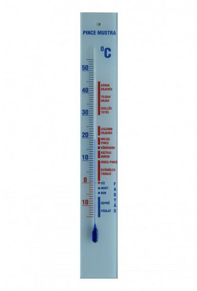 Üveghátlapos pince mustra hőmérő A skálán leolvasható a borok és gyümölcsök megfelelő hőmérsékleten tartása, ill. a borok erjedési hőmérséklete is. Mérési tartomány:-15°... +55°C Méret:420x60mm