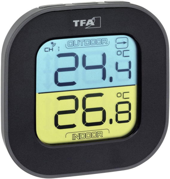 TFA 30.3068. 01 FUN vezeték nélküli hőmérő nedvességmérővel. A bázis akár 3 vezeték nélküli szenzort képes felismerni. A hőmérséklet és a páratartalom értékeit a vezeték nélküli jelnek köszönhetően fogadja a kijelzős bázis, amely szintén rendelkezik hőmérséklet- és páratartalom-érzékelővel. A kijelzőn a felhasználó ugyanabban a pillanatban, azonnal és átkapcsolás nélkül láthatja 4 helyről származó aktuális értékeket. A jobb orientáció érdekében, hogy tudjuk, hol vany az adott érzékelő telepítve, az egyes érzékelők meg is jelölhetők.